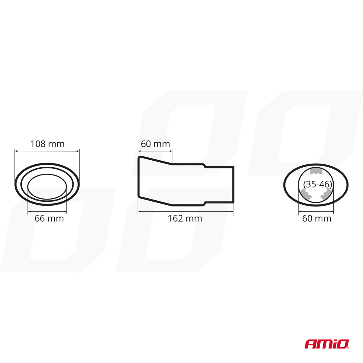 Końcówka uniwersalna nadająca eleganci sportowy wygląd. Poprzez szeroki zakres regulacji uchwytów pasuje do większości samochodów (dwa sposoby montażu: do przykręcenia za pomocą śrub montażowych lub do przyspawania) Końcówka tłumika, chromowana ze stali nierdzewnej. Średnica montażowa: 35 - 46 mm