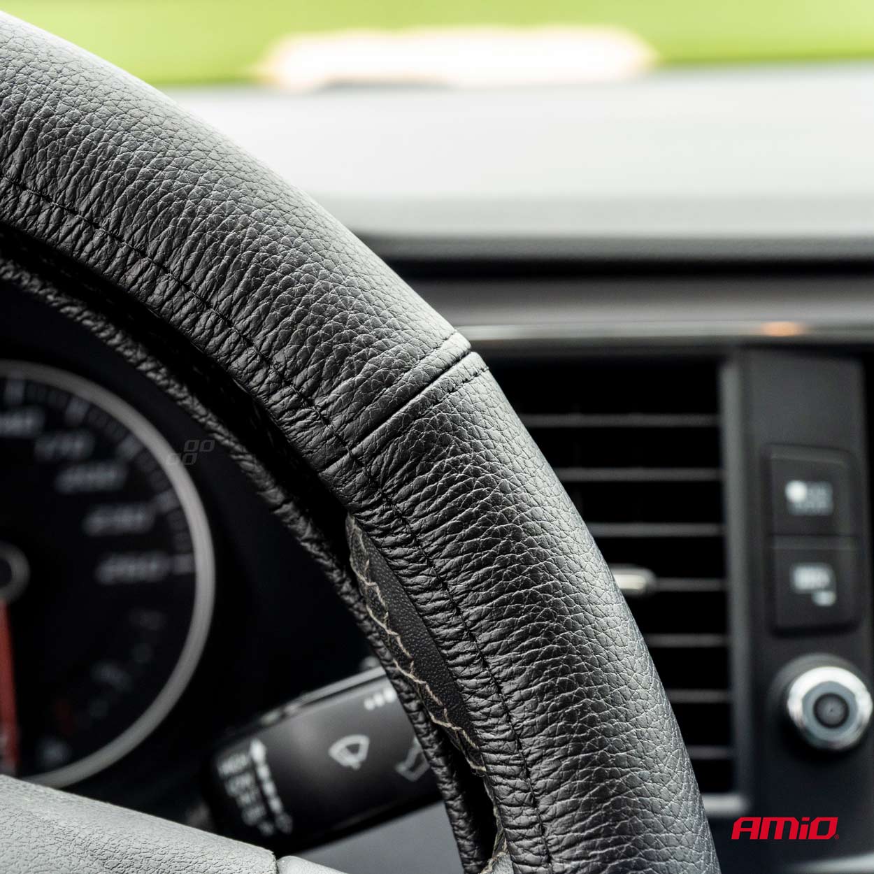 Pokrowiec jest bardzo wygodny oraz świetnie trzyma się w dłoni podczas jazdy. Szybki i prosty montaż, polega wyłącznie na nałożeniu pokrowca na kierownicę. Zastosowanie najwyższej jakości materiałów sprawia, że pokrowiec służy przez długie lata i świetnie prezentuje się w samochodzie. Elementy są ze sobą zszyte mocnymi nićmi używanymi w tapicerstwie samochodowym. Zastosowanie najwyższej jakości materiałów sprawia, że pokrowiec służy przez długie lata i świetnie prezentuje się w samochodzie. • Wykonany z wysokiej jakości materiałów nie wydzielających zapachów • Doskonale chroni kierownicę przed wytarciem lub maskuje powstałe wcześniej zniszczenia • Wewnętrzna strona pokrowca jest antypoślizgowa i zapobiega ślizganiu się nakładki Ważne jest to, aby odpowiednio dobrać rozmiar nakładki do swojej kierownicy. To nic trudnego, wystarczy zmierzyć średnicę kierownicy w swoim aucie od zewnętrzne strony. Rozmiar - 39-41 cm