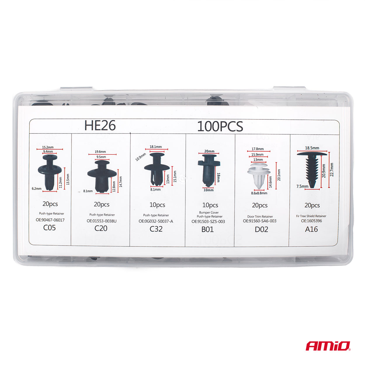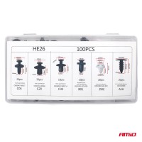 Spinki klipsy kołki samochodowe zestaw 100szt AMIO-02830Uniwersalny zestaw 100 szt różnych spinek, kołków, zatrzasków samochodowych do mocowania tapicerki w samochodzie, błotników, zderzaków, drzwi. W zestawie znajdują się standardowe rozmiary stosowane w większości samochodów osobowych i dostawczych. Cechy i specyfikacja produktu: Zestaw 100 uniwersalnych spinek samochodowych. Komplet 6 najpopularniejszych rodzajów kołków (po 10 / 20 sztuk). Kompaktowe etui z podziałem na opisane przegródki. Materiał: tworzywo sztuczne Kolor: czarny + biały Opakowanie: plastikowe etui